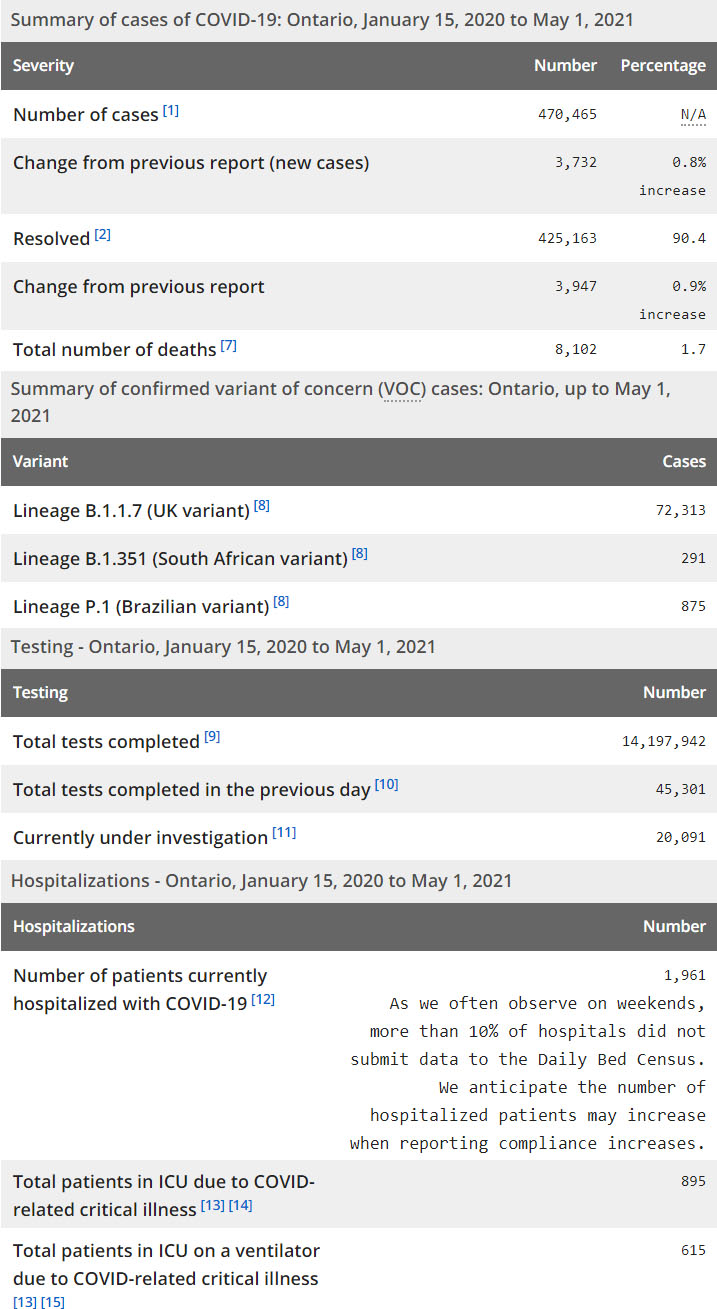 再看看安省方面的详细数据,截止5月1日,安省已对14,197,942例进行了新冠病毒检测(检测数较昨天新增45,301),还有20,091处于被调查阶段。确诊总数470,465(当天新增3732,阳性率上升至8.24%),包括425,163例康复(康复率上升为90.4%)、8102例死亡(增加23例,死亡率仍为1.7%)。住院患者1961例(减少191,有10%医院周末未提交数据);进入ICU患者895例(减少5);IU插呼吸机患者615例(减少22)。