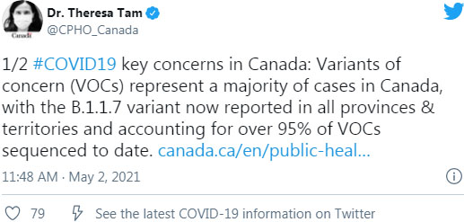 —— 加拿大首席公共卫生官Theresa Tam博士在5月2日表示,目前在加拿大所有省和地区都发现了B117变异病毒,占所有变异病毒的95%以上。Theresa Tam博士警告称,B117变异病毒的传播速度更快,并与疾病严重程度增加有关。仅在安省就已经发现了72313例B117变异病毒,这个数字比昨天增加了2,871,这意味着B117变异病毒病例占了过去24小时内所有新增确诊病例的近77%。