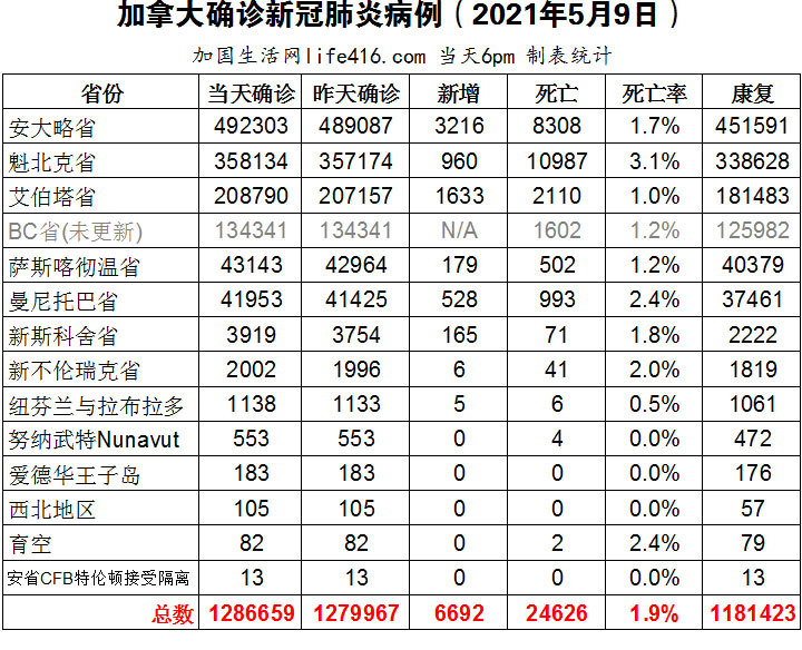【加国生活网编译报道】截至2021年5月9日下午6点,加拿大新冠确诊病例总数为1286659(新增6692),死亡24626(新增58)。安省确诊总数492303(新增3216);魁省确诊总数358134(新增960);艾省确诊总数208790(新增1633);BC省逢周末不更新;萨省确诊总数43143(新增179);曼省确诊总数41953(新增528);新期科舍省总数3919(新增165)。萨省达到“重新开放路线图”疫苗接种门槛,即为70%的40岁及以上居民接种疫苗,5月30日将5月30日将放松部分限制措施;曼省确诊病例激增,温尼伯和布兰登的从幼儿园到12年级的学生转到线上学习;安省当天新增47例死亡病例,再达“第三波”最高死亡记录,多伦多市长表示太快重启经济将会是个错误的决定。加国生活网专门制作了如下统计数据表: