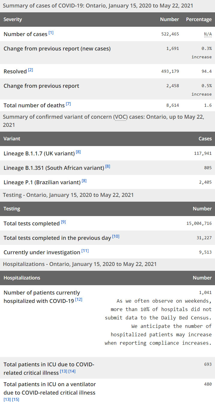 再看看安省方面的详细数据,截止5月22日,安省已对15,004,716例进行了新冠病毒检测(检测数较昨天新增31,227),还有9,513处于被调查阶段。确诊总数522,465(当天新增1,691,阳性率上升至5.41%),包括493,179例康复(康复率上升为94.4%)、8,614例死亡(增加15例,死亡率下降为1.6%)。住院患者1,041例(减少166,周末有10%医院未提交数据);进入ICU患者693例(减少13);IU插呼吸机患者480例(减少24)。