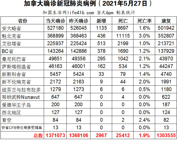【加国生活网编译报道】截至2021年5月27日下午6点,加拿大新冠确诊病例总数为1371073(新增2967),死亡25412(新增51)。安省确诊总数527180(新增1135);魁省确诊总数368899(新增436);艾省确诊总数225937(新增513);BC省确诊总数143264(新增378);曼省确诊总数49651(新增295);萨省确诊总数46163(新增162)。Moderna公司已确认未来两周将有200万剂疫苗运抵加拿大;随着加拿大更多地区开始重新开放,传染病专家警告企业主和个人都应采取一些关键预防措施,以防止更多感染;曼省疫情激增,省府加强卫生限制措施;安省省长福特“剑走偏锋”,公开向医学专家、儿童医院和卫生组织提出7个问题,征询是否要在学期末开放学校;安省西部大学要求9月开学住校学生必须接种至少一剂疫苗。加国生活网专门制作了如下统计数据表: