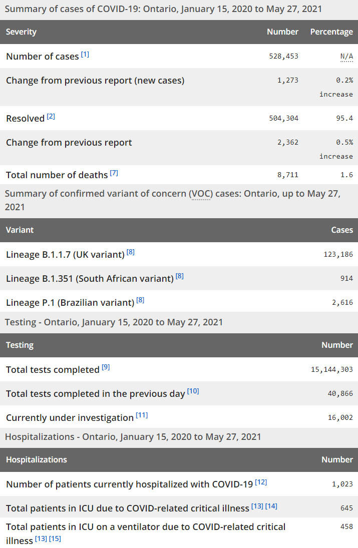 再看看安省方面的详细数据,截止5月27日,安省已对15,144,303例进行了新冠病毒检测(检测数较昨天新增40,866),还有16,002处于被调查阶段。确诊总数528,453(当天新增1,273,阳性率上升至3.12%),包括504,304例康复(康复率上升为95.4%)、8,711例死亡(增加14例,死亡率仍为1.6%)。住院患者1,023例(减少49);进入ICU患者645例(减少5);IU插呼吸机患者458例(增加6)。