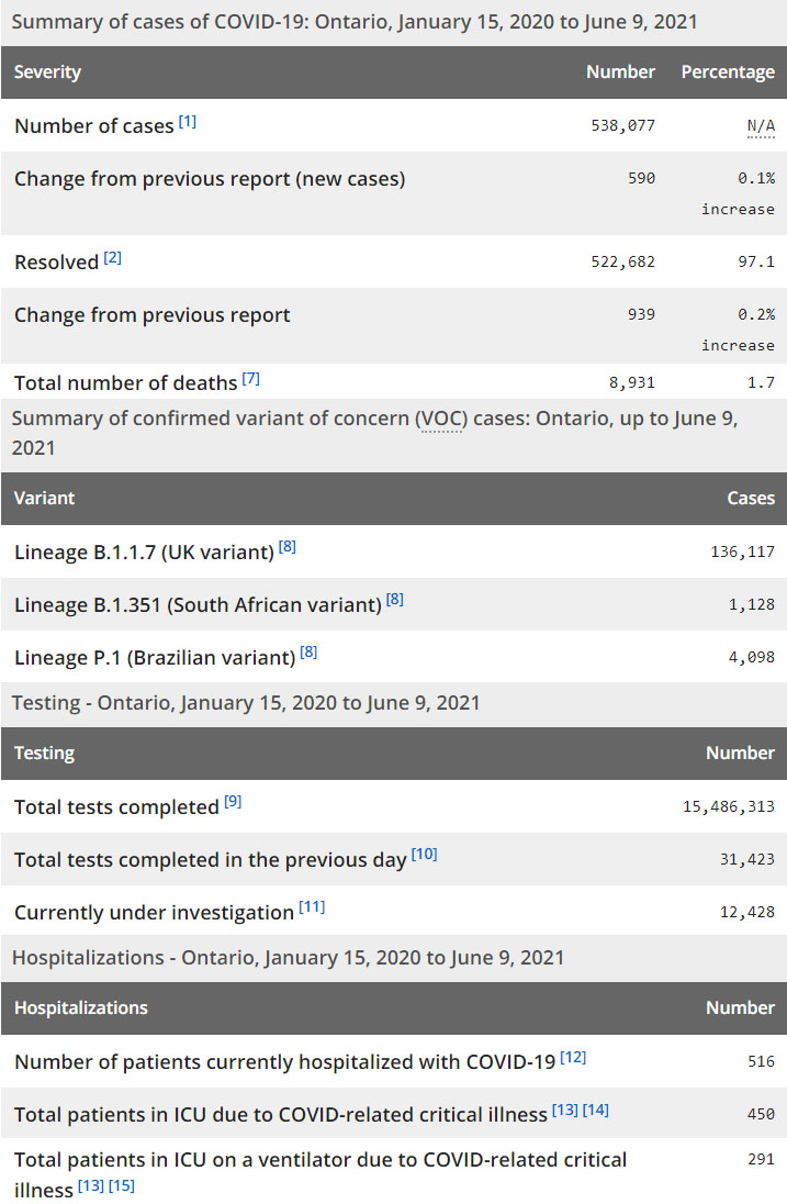 再看看安省方面的详细数据,截止6月9日,安省已对15,486,313例进行了新冠病毒检测(检测数较昨天新增31,423),还有12,428处于被调查阶段。确诊总数538,077(当天新增590,阳性率上升至1.88%),包括522,682例康复(康复率上升为97.1%)、8,931例死亡(增加11例,死亡率仍为1.7%)。住院患者516例(减少55);进入ICU患者450例(减少16);IU插呼吸机患者291例(减少23)。