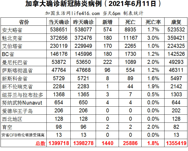 【加国生活网编译报道】截至2021年6月11日下午6点,加拿大新冠确诊病例总数为1399718(新增1440),死亡25886(新增13)。安省确诊总数538651(新增574);魁省确诊总数372656(新增180);艾省确诊总数230119(新增170);BC省确诊总数146176(新增180);曼省确诊总数53872(新增222);萨省确诊总数47764(新增96)。加拿大首席卫生官表示加拿大的新冠疫情已显着改善,国民一剂疫苗接种率目前在全球排名第一;安省连续第二天超过500例;6月11日安省进入重启第一阶段,什么可以做?什么不可以做?加国生活网专门制作了如下统计数据表: