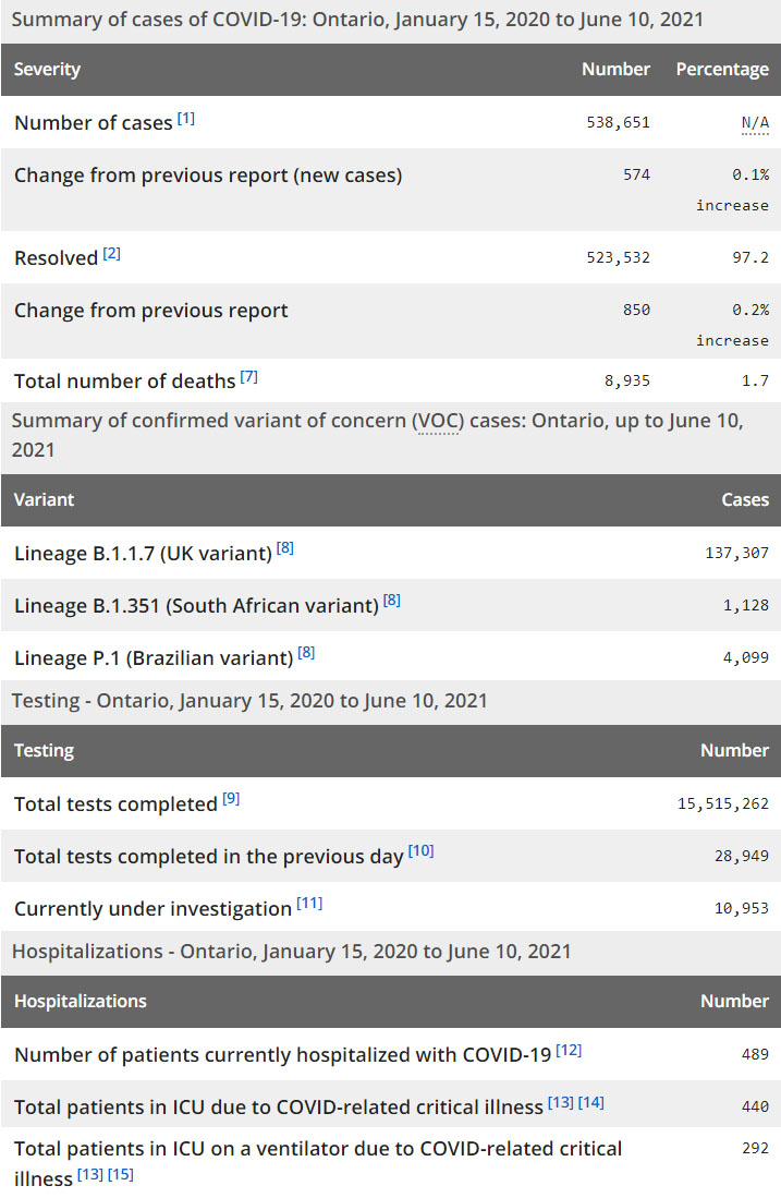 再看看安省方面的详细数据,截止6月10日,安省已对15,515,262例进行了新冠病毒检测(检测数较昨天新增28,949),还有10,953处于被调查阶段。确诊总数538,651(当天新增574,阳性率上升至1.98%),包括523,532例康复(康复率上升为97.2%)、8,935例死亡(增加4例,死亡率仍为1.7%)。住院患者489例(减少27);进入ICU患者440例(减少10);IU插呼吸机患者292例(增加1)。