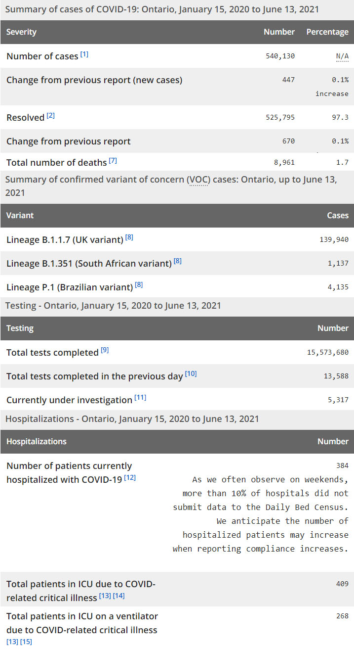 再看看安省方面的详细数据,截止6月13日,安省已对15,573,680例进行了新冠病毒检测(检测数较昨天新增13,588),还有5,317处于被调查阶段。确诊总数540,130(当天新增447,阳性率上升至3.29%),包括525,795例康复(康复率仍为97.3%)、8,961例死亡(增加4例,死亡率仍为1.7%)。住院患者384例(增加11,周末有10%医院未提交数据);进入ICU患者409例(减少17);IU插呼吸机患者268例(减少5)。