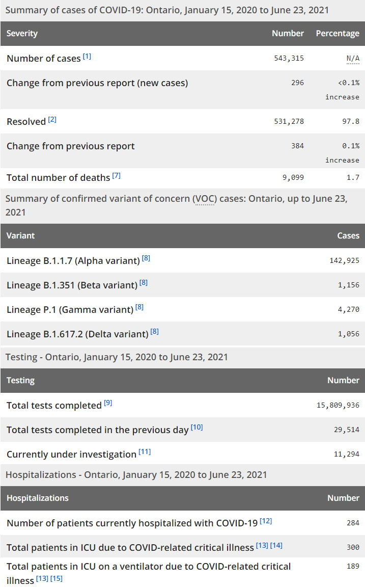 再看看安省方面的详细数据,截止6月23日,安省已对15,809,936例进行了新冠病毒检测(检测数较昨天新增29,514),还有11,294处于被调查阶段。确诊总数543,315(当天新增296,阳性率上升至1.00%),包括531,278例康复(康复率仍为97.8%)、9,099例死亡(增加6例,死亡率仍为1.7%)。住院患者284例(减少11);进入ICU患者300例(减少5);IU插呼吸机患者189例(减少1)。
