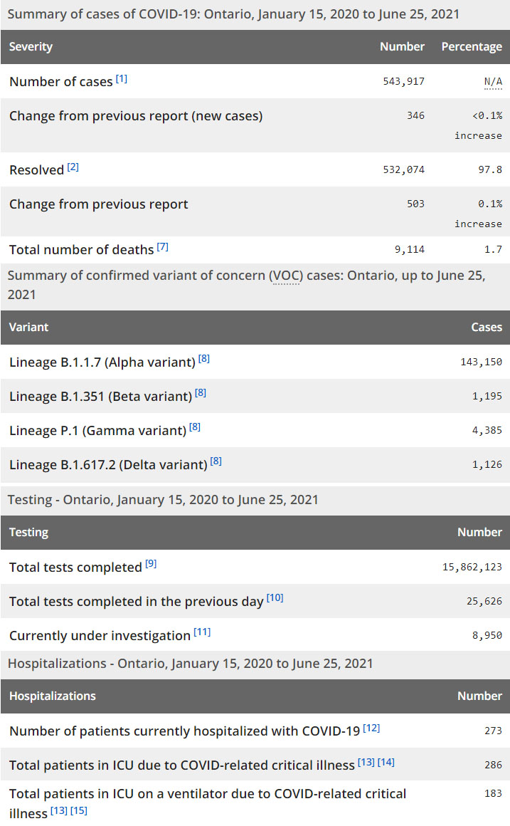 截至6月25日晚上8点,安省共累计接种了13,824,469剂疫苗,其中包括6月25日当天接种的256,260剂疫苗,再创安省疫苗接种的新单日记录。当天还新增13例,使死亡总数达到9,114例。安省目前有273例住院治疗,有286例在重症监护室,其中有183例在呼吸机上。
