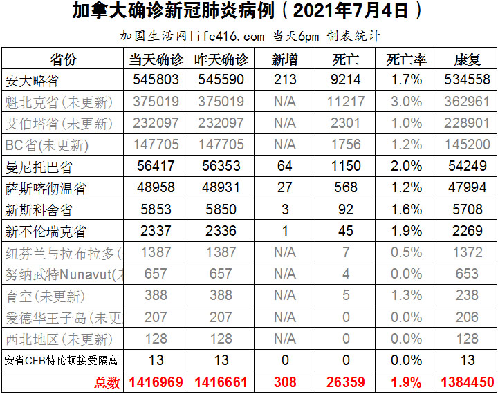 【加国生活网编译报道】截至2021年7月4日下午6点,加拿大新冠确诊病例总数为1416969(新增308),死亡26359(新增11)。安省确诊总数545803(新增213);魁省、艾省和BC省在周末不更新;曼省确诊总数56417(新增64);萨省确诊总数48958(新增27)。尽管在通过广泛接种疫苗和严格坚持公共卫生措施的努力下,加拿大的每日新增病例、住院和死亡人数正继续逐周下降,但加拿大在重新开放方面存在分歧;加拿大首席公共卫生官希望每个国民都能尊重别人继续戴口罩的选择和决定;安省Grey Bruce区的原住民社区进入紧急状态,居民被要求避免任何聚会,并在家里呆两周。加国生活网专门制作了如下统计数据表: