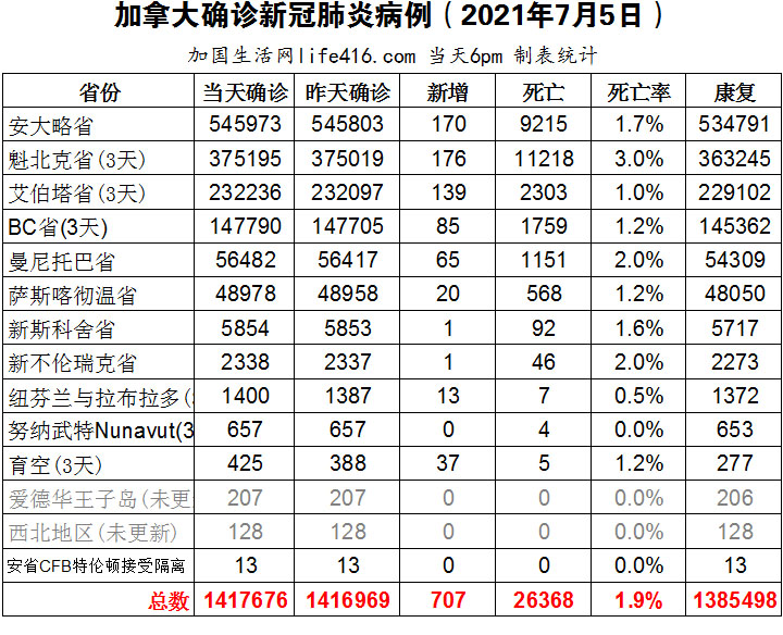 7月1日:加拿大国庆日,所有省份和地区的疫情数据都暂停更新