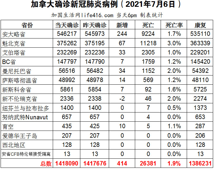 【加国生活网编译报道】截至2021年7月6日下午6点,加拿大新冠确诊病例总数为1418090(新增414),死亡26381(新增13)。安省确诊总数546217(新增244);魁省确诊总数375262(新增67);艾省确诊总数232269(新增33);BC省确诊总数147797(新增7);曼省确诊总数56516(新增34);萨省确诊总数48992(新增14)。安省新增244例确诊病例,其中80例是2020年遗漏病例,78.4%接种了一剂疫苗,47.8%接种了两剂疫苗;多伦多新增3个专门提供辉瑞疫苗的临时诊所,正在寻找辉瑞疫苗的邮编是M1的居民不要错过;美国总统鼓励尚未接种疫苗的美国人接种疫苗;英国宣布计划从7月19日起取消绝大部分疫情限制措施,包括取消口罩强制令和保持身体距离的卫生措施,即便日后每日新增10万。加国生活网专门制作了如下统计数据表: