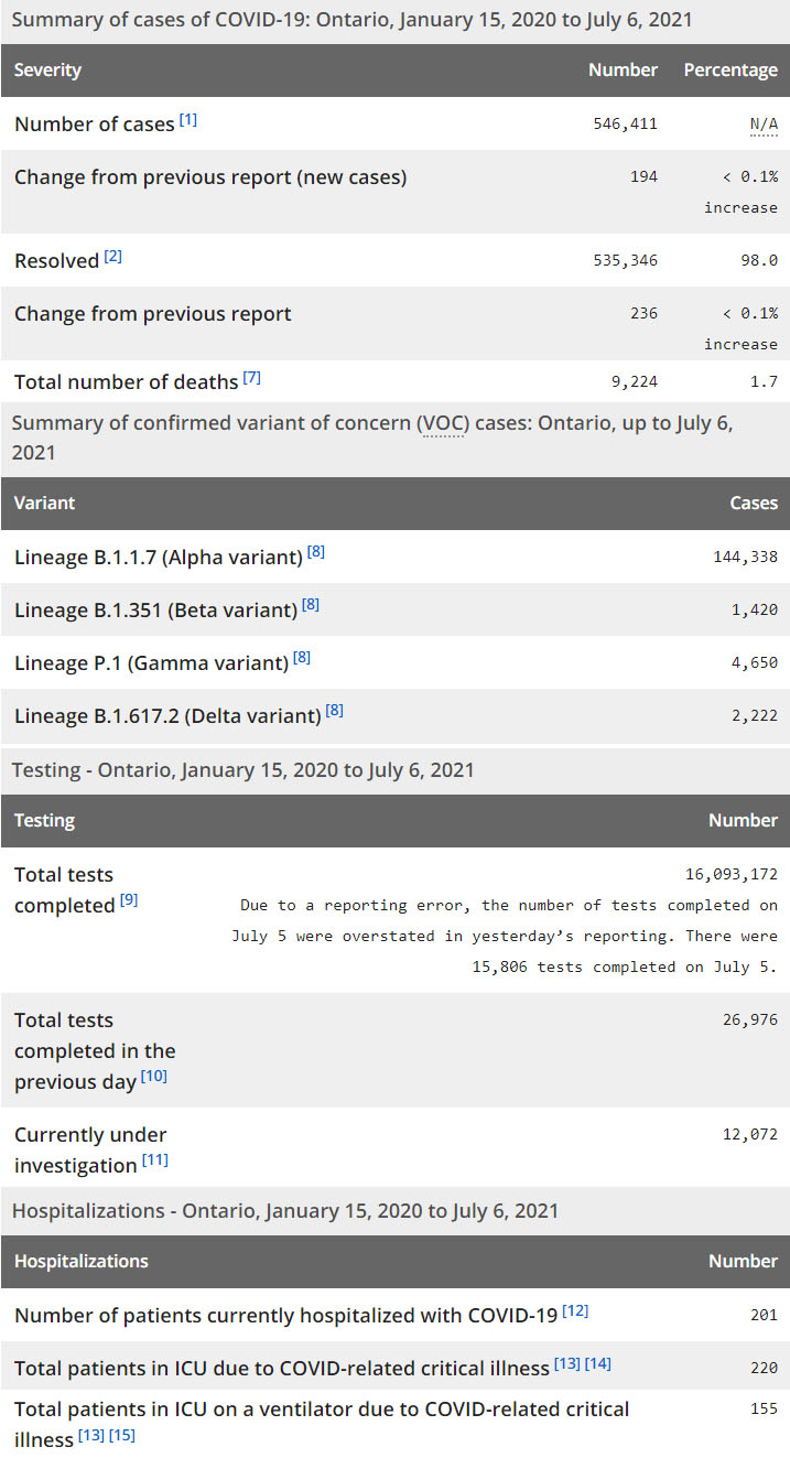 再看看安省方面的详细数据,截止7月6日,安省已对16,093,172例进行了新冠病毒检测(检测数较昨天新增26,976),还有12,072处于被调查阶段。确诊总数546,411(当天新增194;阳性率下降至0.72%),包括535,346例康复(康复率仍为98%)、9,224例死亡(9个月以来首次零死亡,死亡率仍为1.7%)。住院患者201例(减少1);进入ICU患者220例(减少6);IU插呼吸机患者155例(减少6)。