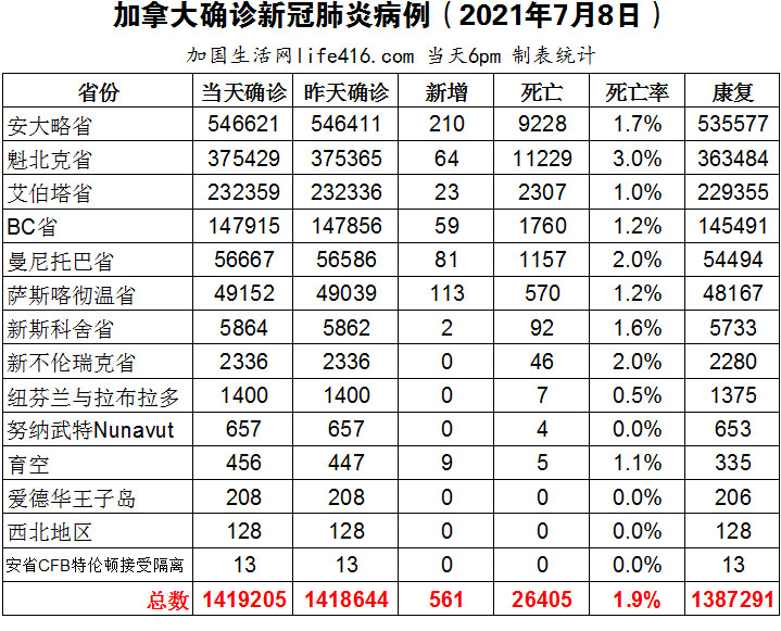 【加国生活网编译报道】截至2021年7月8日下午6点,加拿大新冠确诊病例总数为1419205(新增561),死亡26405(新增18)。安省确诊总数546621(新增210);魁省确诊总数375429(新增64);艾省确诊总数232359(新增23);BC省确诊总数147915(新增59);曼省确诊总数56667(新增81);萨省确诊总数49152(新增113)。加拿大已报告11例Lambda变异病毒病例;有关Lambda变异病毒,您必须了解的相关知识,疫苗可能会保护人类免受Lambda的感染;来自法国的最新研究为疫苗能对变异病毒提供强有力保护作用增加了证据;安省有超过51%的省民已完全接种了疫苗;加拿大有77.9%的国民至少接种了一剂疫苗,但一剂疫苗接种增幅变缓;Delta变异病毒在美国疫苗接种率低地区激增。加国生活网专门制作了如下统计数据表: