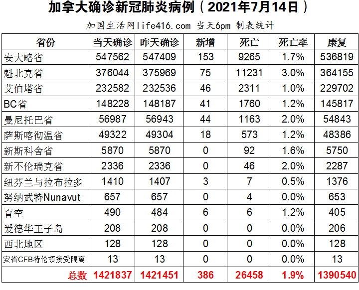 【加国生活网编译报道】截至2021年7月14日下午6点,加拿大新冠确诊病例总数为1421837(新增386),死亡26458(新增8)。安省确诊总数547562(新增153);魁省确诊总数376044(新增75)、艾省确诊总数232582(新增46)、BC省确诊总数148228(新增41);曼省确诊总数56987(新增44);萨省确诊总数49322(新增18)。世界卫生组织WHO警告称全球新冠死亡人数在连续九周下降后再次上升;安省总检察长表示无意发布安省疫苗护照;安省首席卫生官称有信心让安省在8月6日之前走出重启计划第三步,而提高疫苗接种率是实现这一目标的主要办法;万锦明天无需要预约即可接种辉瑞疫苗第一剂。加国生活网专门制作了如下统计数据表: