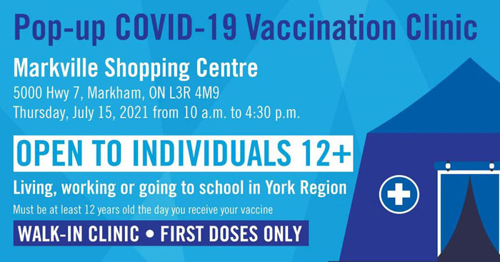 —— 最新消息,万锦市将于7月15日在Markville商场开设临时疫苗诊所,由上午10点至下午4:30提供接种Pfizer辉瑞疫苗第一剂,12岁以上居住或工作在万锦的人士均可接种,无需预约。请注意,只限第一剂!