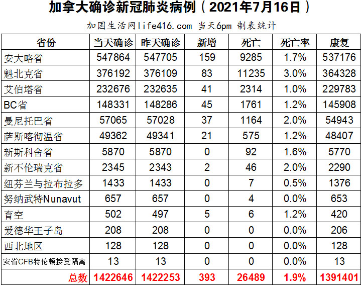 【加国生活网编译报道】截至2021年7月16日下午6点,加拿大新冠确诊病例总数为1422646(新增393),死亡26489(新增17)。安省确诊总数547864(新增159);魁省确诊总数376192(新增83)、艾省确诊总数232676(新增41)、BC省确诊总数148331(新增45);曼省确诊总数57065(新增37);萨省确诊总数49362(新增21)。安省每日新增病例连续一周低于200例,Grey Bruce区Delta变异病毒病例激增;多伦多蓝鸟队将于7月30日返回多伦多并在罗杰斯中心进行主场比赛;美国新冠确诊病例比前一周增加了70%,死亡人数增加了26%。加国生活网专门制作了如下统计数据表:
