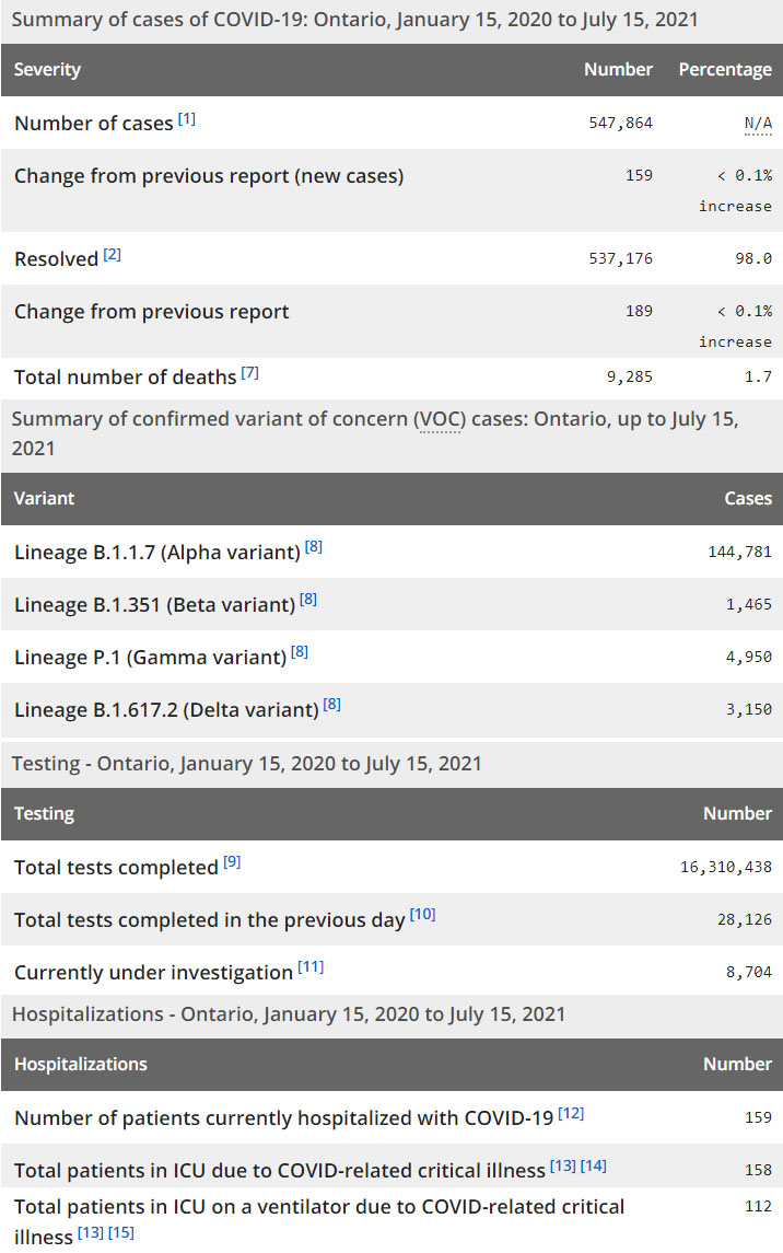 —— 安省在7月16日新增159例确诊病例,连续一周低于200例。当天还新增10例死亡病例,使官方死亡人数达到9,285。随着安省在7月16日进入重新开放计划的第3阶段,对企业和聚会的公共卫生限制进一步取消。安省省府表示,大部分剩余限制将在第3阶段之后的21天后尽快取消。但是,只有在12岁及以上的人中有75%已完全接种疫苗,并且每个公共卫生单位都已为至少70%的合格居民完全接种疫苗后,这种情况才会发生。