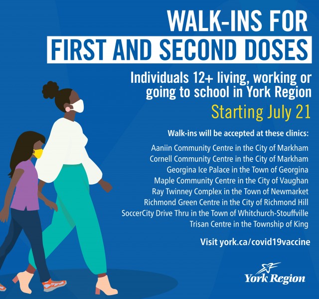 —— 约克区政府在7月20日发布消息称,从7月21日星期三起,约克区8个疫苗诊所将不需要预约,直接开放给所有在约克区居住、工作和学习的12岁及以上人士接种第一剂和第二剂。这8个疫苗诊所分别是: