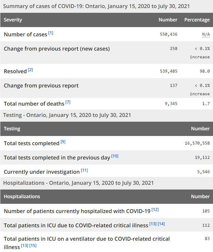 再看看安省方面的详细数据,截止7月30日,安省已对16,570,558例进行了新冠病毒检测(检测数较昨天新增19,112),还有5,546处于被调查阶段。确诊总数550,436(当天新增258;阳性率上升至1.35%),包括539,485例康复(康复率仍为98.0%)、9,345例死亡(新增6例,死亡率仍为1.7%)。住院患者105例(减少3);进入ICU患者112例(减少5);IU插呼吸机患者83例(增加6)。