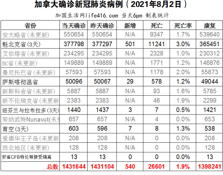 【加国生活网编译报道】截至2021年8月2日下午6点,加拿大新冠确诊病例总数为1431644(3天新增540),死亡26601(新增1)。魁省确诊总数388898(3天新增501,当天新增154);萨省确诊总数50096(新增29);其余省份在Civic Holiay假期都未更新。加拿大首席公共卫生官警告称如果在足够多的国民完全接种疫苗前就太快解封,那么全国的疫情将会急剧反扑;魁省周末三天新增501例确诊病例,周日阳性率达到了1.4%,传染病专家认为魁省目前的疫情形势令人担忧;丹麦国家血清研究所表示,第一剂接种AstraZeneca疫苗,第2剂无论接种辉瑞疫苗还是莫德纳疫苗,都能产生“良好防护力”。加国生活网专门制作了如下统计数据表: