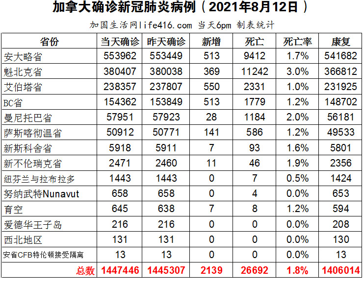 【加国生活网编译报道】截至2021年8月12日下午6点,加拿大新冠确诊病例总数为1447446(新增2139),死亡26692(新增4)。安省确诊总数553962(新增513);魁省确诊总数380407(新增369)、艾省确诊总数238357(新增550)、BC省确诊总数154362(新增513);曼省确诊总数57951(新增28);萨省确诊总数50912(新增141)。随着加拿大疫苗接种计划在新冠确诊病例数不断增加的情况下停滞不前,联邦政府正在考虑为一些人群强制接种疫苗;BC省首席卫生管宣布一项新的公共卫生令,在BC省长期护理院工作的人都必须强制接种疫苗;安省新增513例确诊病例,创自6月14日以来首次单日新增超过500例记录。加国生活网专门制作了如下统计数据表: