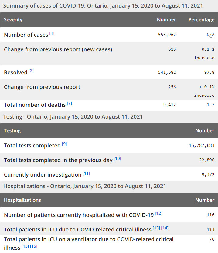 再看看安省方面的详细数据,截止8月11日,安省已对16,787,683例进行了新冠病毒检测(检测数较昨天新增22,896),还有9,372处于被调查阶段。确诊总数553,962(当天新增513;阳性率上升至2.24%),包括541,682例康复(康复率仍为97.8%)、9,412例死亡(新增0例,死亡率仍为1.7%)。住院患者116例(增加8);进入ICU患者113例(增加5);IU插呼吸机患者76例(增加6)。