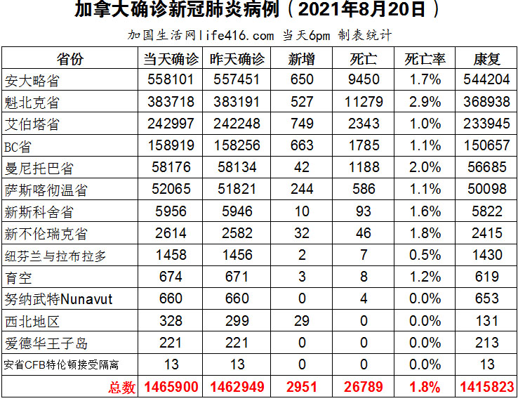 【加国生活网编译报道】截至2021年8月20日下午6点,加拿大新冠确诊病例总数为1465900(新增2951),死亡26789(新增6)。安省确诊总数558101(新增650);魁省确诊总数383718(新增527)、艾省确诊总数242997(新增749)、BC省确诊总数158919(新增663);曼省确诊总数58176(新增42);萨省确诊总数52065(新增244)。安省新增650例确诊病例,创自6月初以来的单日最多记录,重症监护病房患者总数已连续六天增加;安省交通局表示,Metrolinx计划要求其员工接种疫苗,其他运输机构也已被指示制定疫苗接种政策;加拿大五大银行很快将要求所有返回办公室的员工接种疫苗,不接种疫苗的员工必须同意定期做检测。加国生活网专门制作了如下统计数据表:
