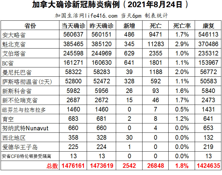【加国生活网编译报道】截至2021年8月24日下午6点,加拿大新冠确诊病例总数为1476161(新增2542),死亡26848(新增34)。安省确诊总数560637(新增486);魁省确诊总数385465(新增345)、艾省确诊总数245598(新增619)、BC省确诊总数161271(新增641);曼省确诊总数58322(新增39);萨省确诊总数52800(2天新增328)。加拿大传染病专家们认为很难准确预测加拿大在“第四波”疫情中的表现,随着 delta变异病毒的继续传播,疫情将如何发展有三个关键因素;BC省从8月25日起恢复口罩强制令,重新强制要求室内公共场所戴口罩,并将要求4年级及以上的学生今年秋季在学校戴口罩;安省正在继续其疫苗计划的“最后一英里战略”,以覆盖尚未接种第一剂或第二剂疫苗的人群。加国生活网专门制作了如下统计数据表: