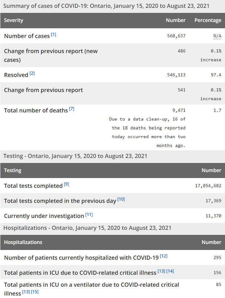 —— 安省在8月24日新增486例确诊病例,有372例(77%)是属于未接种疫苗、只接种一剂疫苗或未告知疫苗接种状态,另外114例(近23%)属于已接种了两剂疫苗。从地区来看,多伦多128例、皮尔区83例、温莎47例、Hamilton 45例、约克区45例。当天还新增18例死亡病例,其中16例为两个多月前的历史遗漏数据。