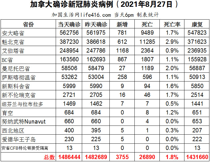 【加国生活网编译报道】截至2021年8月27日下午6点,加拿大新冠确诊病例总数为1486444(新增3755),死亡26890(新增26)。安省确诊总数562756(新增781);魁省确诊总数387230(新增612)、艾省确诊总数248954(新增1168)、BC省确诊总数163560(新增867);曼省确诊总数58506(新增27);萨省确诊总数53262(新增258)。加拿大卫生部在8月27日宣布批准Moderna疫苗用于12至17岁青少年人群;安省新增781例,创今年6月初安省宣布结束居家令以来最高记录;安省有可能会在下周宣布采用“疫苗护照”。加国生活网专门制作了如下统计数据表: