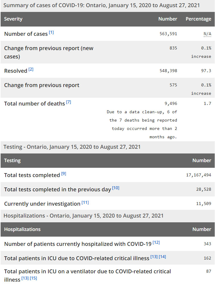 再看看安省方面的详细数据,截止8月27日,安省已对17,167,494例进行了新冠病毒检测(检测数较昨天新增28,528),还有11,509处于被调查阶段。确诊总数563,591(当天新增835;阳性率上升至2.93%),包括548,398例康复(康复率仍为97.3%)、9,496例死亡(新增7例,其中6例为2个月前的遗漏数据,死亡率仍为1.7%)。住院患者343例(增加37);进入ICU患者162例(增加4);IU插呼吸机患者87例(未变)。
