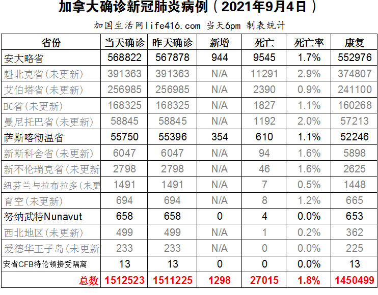 【加国生活网编译报道】截至2021年9月4日下午6点,加拿大新冠确诊病例总数为1512523(新增1298),死亡27015(新增9)。安省确诊总数568822(新增944);萨省确诊总数55750(新增354);其余省份逢周末均未更新。安省新增944例确诊病例,创自5月底以来的最高记录,其中22%属于已接种了两剂疫苗;约克区卫生部要求在家中或工作场所举办社交聚会的人实施接触者追踪政策;有关加拿大第三剂疫苗的最新进展。加国生活网专门制作了如下统计数据表: