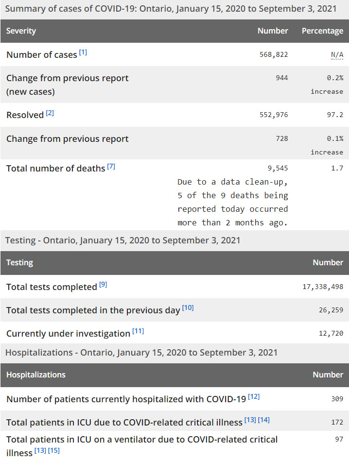再看看安省方面的详细数据,截止9月3日,安省已对17,338,498例进行了新冠病毒检测(检测数较昨天新增26,259),还有12,720处于被调查阶段。确诊总数568,822(当天新增944;阳性率上升至3.59%),包括552,976例康复(康复率仍为97.2%)、9,545例死亡(新增9例,其中5例是2个月前的遗漏数据,死亡率仍为1.7%)。住院患者309例(减少17);进入ICU患者172例(增加3);IU插呼吸机患者97例(减少8)。