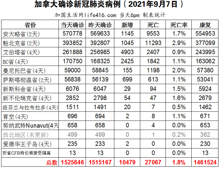 【加国生活网编译报道】截至2021年9月7日下午6点,加拿大新冠确诊病例总数为1525646(4天新增10479,当天新增3357),死亡27067(4天新增46)。安省确诊总数570778(2天新增1145,当天新增564);魁省确诊总数393852(2天新增1045,当天新增515)、艾省确诊总数261888(4天新增4903,当天新增1303)、BC省确诊总数170750(4天新增2425,当天新增533);曼省确诊总数59000(4天新增155,当天新增36);萨省确诊总数56838(2天新增699,当天新增305)。加拿大从9月7日起向来自世界各地完全接种疫苗的旅行者开放边境,并允许他们不用进行14天隔离;LabourDay长周末四天,BC省共新增2425例,艾省共新增4903例。加国生活网专门制作了如下统计数据表: