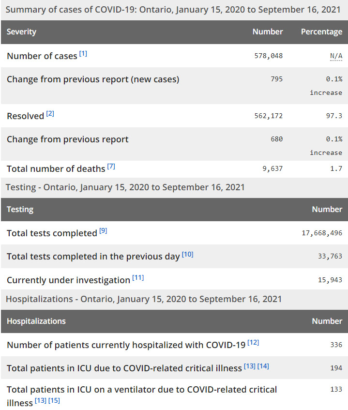 再看看安省方面的详细数据,截止9月16日,安省已对17,668,496例进行了新冠病毒检测(检测数较昨天新增33,763),还有15,943处于被调查阶段。确诊总数578,048(当天新增795;阳性率下降至2.35%),包括562,172例康复(康复率仍为97.3%)、9,637例死亡(新增5例,死亡率仍为1.7%)。住院患者336例(减少12);进入ICU患者194例(增加3);IU插呼吸机患者133(增加13)。