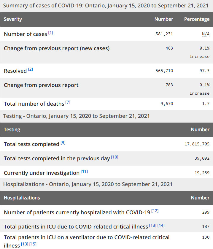 再看看安省方面的详细数据,截止9月21日,安省已对17,815,705例进行了新冠病毒检测(检测数较昨天新增39,092),还有19,259处于被调查阶段。确诊总数581,231(当天新增463;阳性率下降至1.18%),包括565,710例康复(康复率仍为97.3%)、9,670例死亡(新增7例,死亡率仍为1.7%)。住院患者299例(减少31);进入ICU患者187例(增加8);IU插呼吸机患者130(未变)。