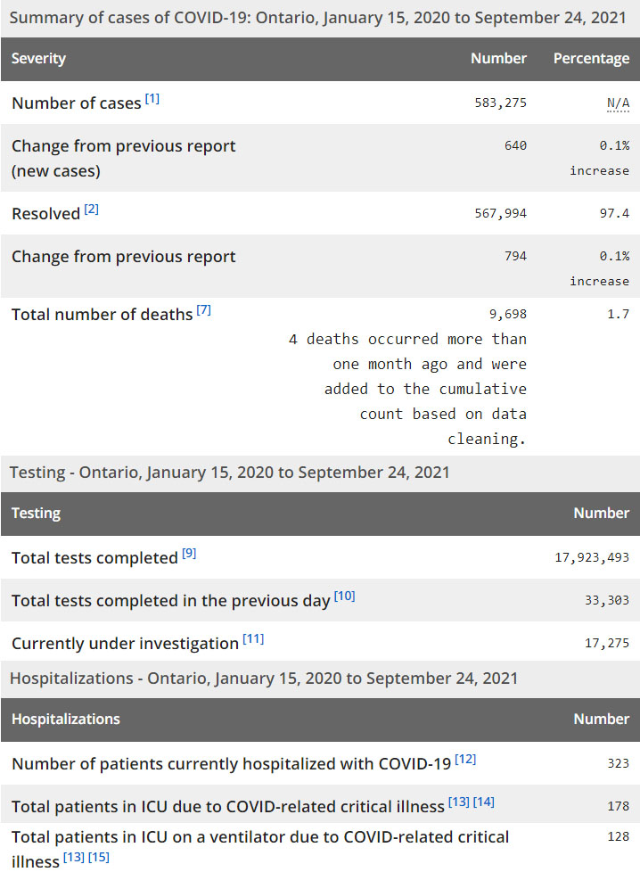 再看看安省方面的详细数据,截止9月24日,安省已对17,923,493例进行了新冠病毒检测(检测数较昨天新增33,303),还有17,275处于被调查阶段。确诊总数583,275(当天新增640;阳性率下降至1.92%),包括567,994例康复(康复率仍为97.4%)、9,698例死亡(新增10例,其中4例为1个多月前的遗漏数据,死亡率仍为1.7%)。住院患者323例(增加15);进入ICU患者178例(减少15);IU插呼吸机患者128(减少6)。