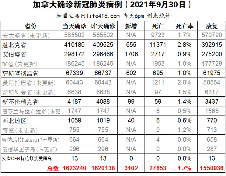 由于好多省份逢在9月30日没有更新,加国生活网小编制作的曲线图也只能暂停,等明天发布更新数据后,小编会根据最新数据制作图表。