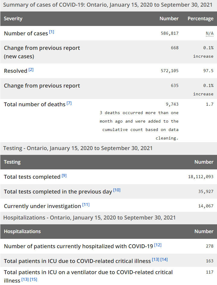 再看看安省方面的详细数据,截止9月30日,安省已对18,112,093例进行了新冠病毒检测(检测数较昨天新增35,927),还有14,067处于被调查阶段。确诊总数586,817(当天新增668;阳性率下降至1.86%),包括572,105例康复(康复率上升为97.5%)、9,743例死亡(新增20例,其中3例为1个多月前的遗漏数据,死亡率仍为1.7%)。住院患者278例(减少14);进入ICU患者163例(减少9);IU插呼吸机患者117(减少6)。
