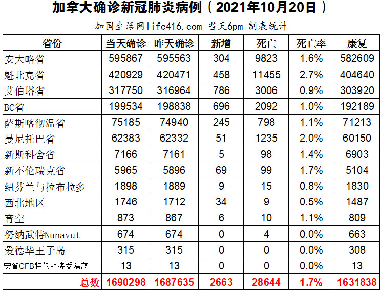 【加国生活网编译报道】截至2021年10月20日下午6点,加拿大新冠确诊病例总数为1690298(新增2663),死亡28644(新增41)。安省确诊总数595867(新增304);魁省确诊总数420929(新增458);艾省确诊总数317750(新增786);BC省确诊总数199534(新增696);萨省确诊总数75185(新增245);曼省确诊总数62383(新增51)。艾省疫情达到了一个严峻里程碑—死亡病例超过3千例,位列加拿大各省第三位,加拿大全国共死亡28644例;萨省首席卫生官崩溃—如果不采取额外公共卫生措施,到新年时重症监护的人数会达到顶峰;美国食品和药物管理局批准了Moderna和强生公司加强剂疫苗。加国生活网专门制作了如下统计数据表: