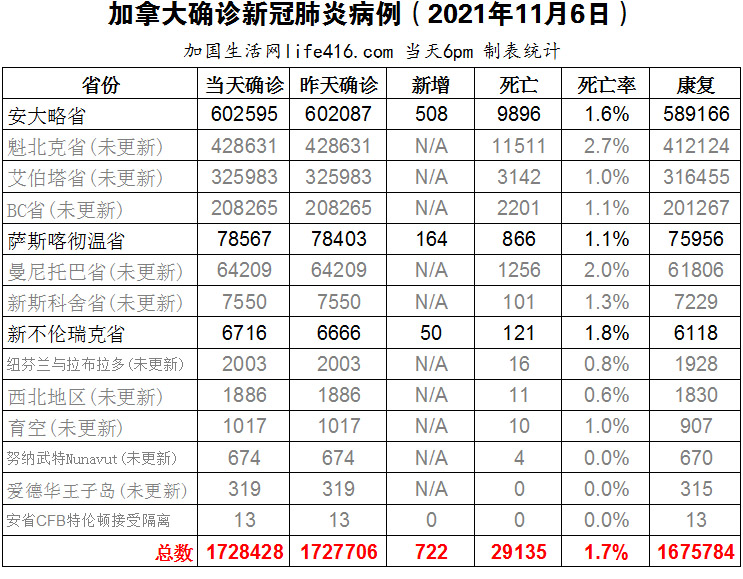 【加国生活网编译报道】2021年11月7日星期日凌晨夏时制(Summer Time)结束,11月6日星期六晚上睡觉前别忘记将时钟回拨一个小时。另外,11月7日星期日是中国农历的“立冬”日,代表着2021年的冬天正式到来。截至2021年11月6日下午6点,加拿大新冠确诊病例总数为1728428(新增722),死亡29135(新增3)。安省确诊总数602595(新增508);萨省确诊总数78567(新增164);新不伦瑞克省确诊总数6716(新增50);其余省份逢周末不更新数据。新冠病毒可以通过两种主要方式通过空气传播,一种称为气溶胶的微小空气传播颗粒,它像烟雾一样在空气中徘徊,另一种为较大的呼吸道飞沫,它能迅速落到地面。加国生活网专门制作了如下统计数据表: