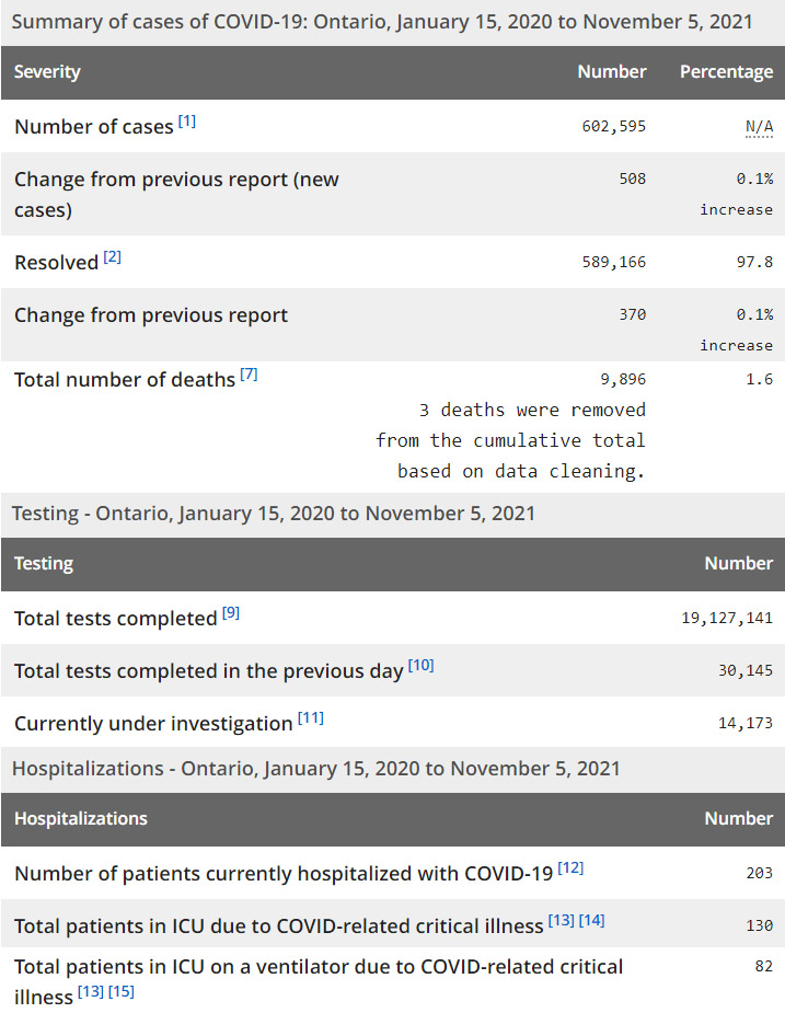 再看看安省方面的详细数据,截止11月5日,安省已对19,127,141例进行了新冠病毒检测(检测数较昨天新增30,145),还有14,173处于被调查阶段。确诊总数602,595(当天新增508;阳性率下降至1.69%),包括589,166例康复(康复率仍为97.8%)、9,896例死亡(增加0例,死亡率仍为1.6%)。住院患者203例(减少22例);进入ICU患者130例(增加1);IU插呼吸机患者82(增加1)。