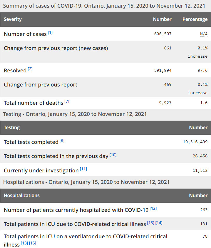 在当天的661例确诊病例中,其中有388例(59%)是属于未接种疫苗、只接种一剂疫苗或未告知疫苗接种状态,另外273例(41%)属于已接种了两剂疫苗。从地区来看,多伦多86例、约克区54例、Simcoe Muskoka地区50例、渥太华49例、温莎43例、Sudbury地区35例、Durham地区35例、皮尔区27例。截至11月13日晚8点,12岁及以上的安省省民中,88.672%接种了一剂疫苗,85.433%接种了两剂疫苗。