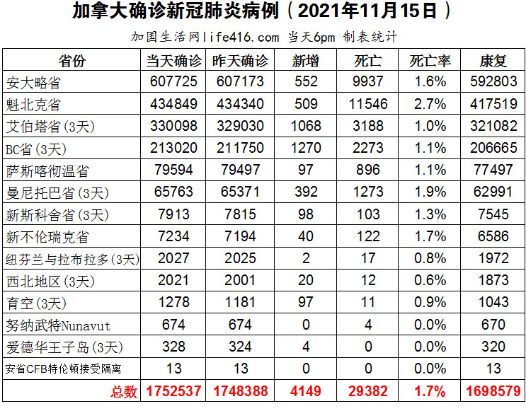 【加国生活网编译报道】截至2021年11月15日下午6点,加拿大新冠确诊病例总数为1752537(3天新增4149,当天2236),死亡29382(3天新增45)。安省确诊总数607725(新增552);魁省确诊总数434849(新增509);艾省确诊总数330098(3天新增1068,当天新增286);BC省确诊总数213020(3天新增1270,当天新增381);萨省确诊总数79594(新增97);曼省确诊总数65763(3天新增392,当天新增157)。一些传染病专家认为近期出现“突破性感染(breakthrough infections)”比例的上升可能与疫苗保护力逐渐下降有关,但并不是所有传染病专家都赞成加拿大成年人都去接种第三剂加强剂疫苗。加国生活网专门制作了如下统计数据表: