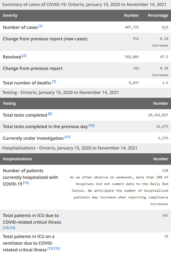 在当天的552例确诊病例中,其中有340例(62%)是属于未接种疫苗、只接种一剂疫苗或未告知疫苗接种状态,另外212例(38%)属于已接种了两剂疫苗。从地区来看,多伦多85例、皮尔区51例、约克区49例、Simcoe-Muskoka地区44例、渥太华37例。截至11月15日晚8点,12岁及以上的安省省民中,88.725%接种了一剂疫苗,85.535%接种了两剂疫苗。