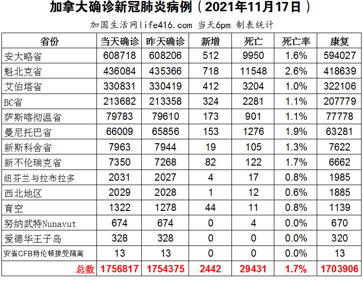 【加国生活网编译报道】截至2021年11月17日下午6点,加拿大新冠确诊病例总数为1756817(新增2442),死亡29431(新增28)。安省确诊总数608718(新增512);魁省确诊总数436084(新增718);艾省确诊总数330831(新增412);BC省确诊总数213682(新增324);萨省确诊总数79783(新增173);曼省确诊总数66009(新增153)。有消息称在国外进行短途旅行的完全接种疫苗的加拿大人在返回加拿大时很快将不再需要新冠病毒分子检测呈阴性的证据了;安省当天新增512例确诊病例和12例死亡病例,死亡人数创近一个月以来单日死亡人数最高记录。加国生活网专门制作了如下统计数据表: