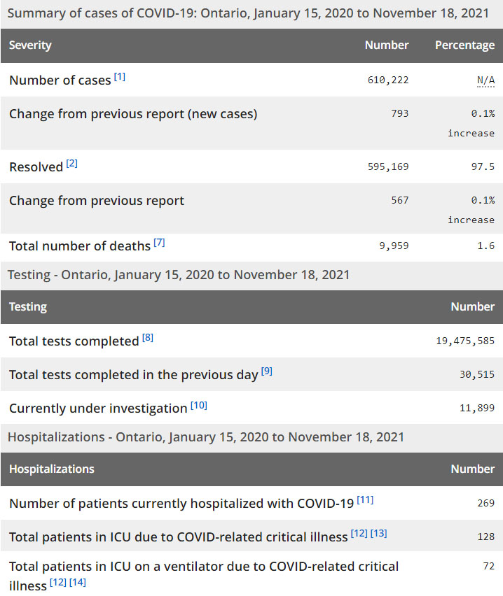 再看看安省方面的详细数据,截止11月18日,安省已对19,475,585例进行了新冠病毒检测(检测数较昨天新增30,515),还有11,899处于被调查阶段。确诊总数610,222(当天新增793;阳性率上升至2.60%),包括595,169例康复(康复率下降为97.5%)、9,959例死亡(增加4例,死亡率仍为1.6%)。住院患者269例(减少9例);进入ICU患者128例(减少1);IU插呼吸机患者72(减少6)。