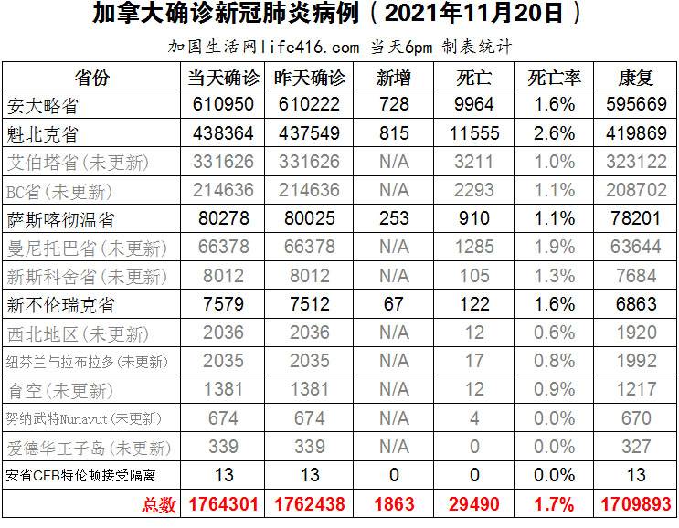 【加国生活网编译报道】截至2021年11月20日下午6点,加拿大新冠确诊病例总数为1764301(新增1863),死亡29490(新增10)。安省确诊总数610950(新增728);魁省确诊总数438364(新增815);萨省确诊总数80278(新增253);新不伦瑞克省确诊总数7579(新增67);其余省份逢周末不更新。加拿大正式宣布修改边境新冠病毒检测措施,出国旅行时间少于72小时且已完全接种疫苗的加拿大人,返回加拿大时将不需要在边境出示PCR检测的阴性证明;加拿大卫生部将国药和科兴疫苗加入加拿大所认可的疫苗清单。加国生活网专门制作了如下统计数据表:
