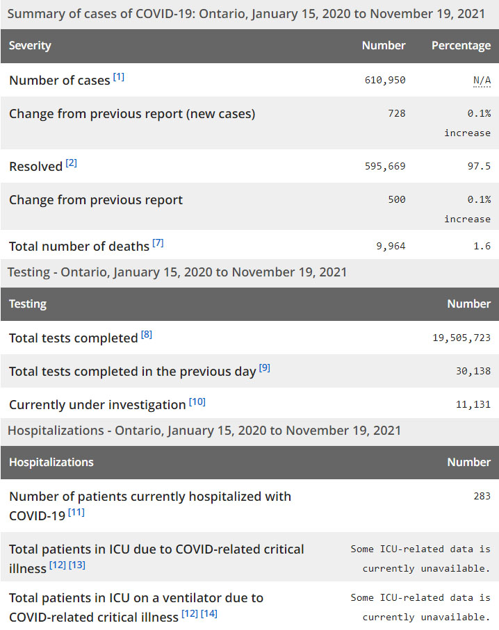 再看看安省方面的详细数据,截止11月19日,安省已对19,505,723例进行了新冠病毒检测(检测数较昨天新增30,138),还有11,131处于被调查阶段。确诊总数610,950(当天新增728;阳性率下降至2.42%),包括595,669例康复(康复率仍为97.5%)、9,964例死亡(增加5例,死亡率仍为1.6%)。住院患者283例(增加14例);进入ICU患者128例(数据错误);IU插呼吸机患者72(数据错误)。