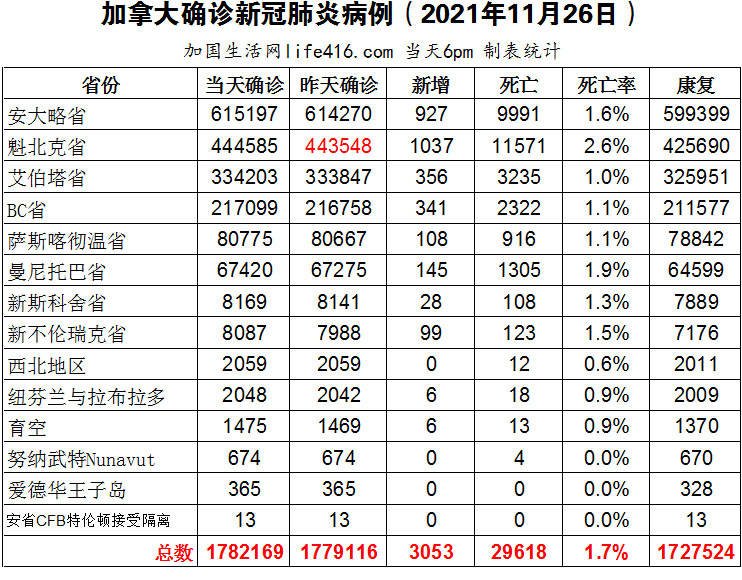 【加国生活网编译报道】截至2021年11月26日下午6点,加拿大新冠确诊病例总数为1782169(新增3053),死亡29618(新增18)。安省确诊总数615197(新增927);魁省确诊总数444585(新增1037,当天该省调整历史数据,新增自疫情以来遗留的1302例);艾省确诊总数334203(新增356);BC省确诊总数217099(新增341);萨省确诊总数80775(新增108);曼省确诊总数67420(新增145)。世卫组织宣布在南非发现的B.1.1.529变异病毒为“受关注变异病毒”,并将其命名为omicron;加拿大禁止来自南部非洲七个国家的旅行者入境,所有在过去14天内从南部非洲抵达加拿大的人都必须立即进行病毒检测并居家隔离;安省新增927例确诊病例,创安省近三个月以来单日最高记录。加国生活网专门制作了如下统计数据表: